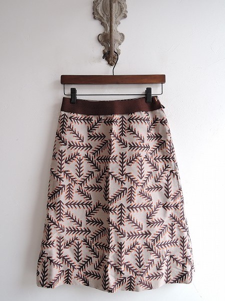 デザイン:mina perhonen 「twig」のシルク混総柄スカートです。カラーはベージュ×ブラックの斜めライン入り生地ベースに、こげ茶・やや光沢あるオレンジの総柄であしらわれております。ウエストにはテープが施され、左サイドのホック&ファスナーで着脱でき、裏地付きです。 (掲載写真は、実商品のカラーにできるだけ近づけるよう努力はしておりますが、お使いのモニターや画面設定等によっては、色が異なって見える場合もございますので、予めご了承下さい)