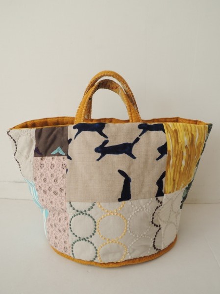 デザイン:mina perhonenのpiece2周年記念バスケットバッグです。『run run run』・『tambourine』・『bird』等の様々なテキスタイルが使用された贅沢なお品で、底・内側に明るい山吹色の裏地が付いたデザインです。中綿入りのふっくらとしたお品で、定価は27,300円程です。
