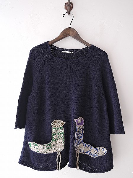 デザイン:mina perhonen 「mingling」のニットプルオーバーです。カラーはネイビーで、鳥の刺繍が施されたニット素材であしらわれております。両腰&バック右裾にポケットがあり、袖口に2cmのスリット入りです。 (掲載写真は、実商品のカラーにできるだけ近づけるよう努力はしておりますが、お使いのモニターや画面設定等によっては、色が異なって見える場合もございますので、予めご了承下さい)