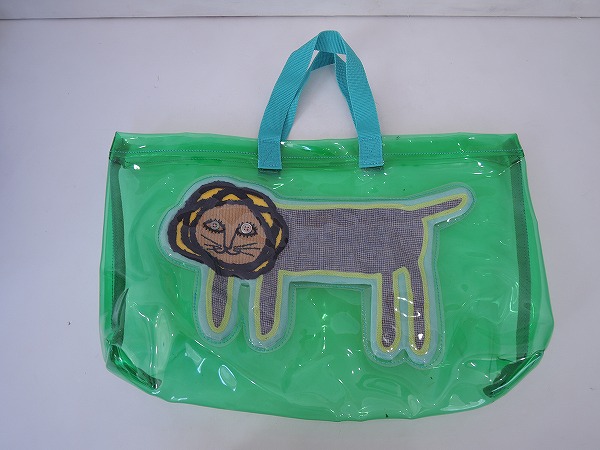 デザイン:mina perhonenのlookシリーズのビニールバッグです。カラーはクリアグリーンで、中央部分にはブルー・黄緑・淡いパープル等の細かなチェック織り生地の体に、ライトブラウンのお顔、イエローのたてがみ、ネイビーのパイル刺繍、ボタンがあしられたライオンさんがあしらわれています。持ち手はライトブルーです。