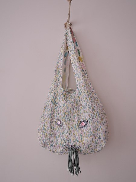 デザイン:mina perhonenの jellybeansシリーズのうさバッグ大です。カラーはオフホワイトベースにイエロー・グリーン・ピンク等のカラフルな楕円ドット柄で、フロントにグレーの刺繍とレザー紐、ピンクのシェルボタンでお顔が施されています。持ち手はお耳の様にあしらわれており、内側にはポケットが1つ付いています。素材は麻100%です。