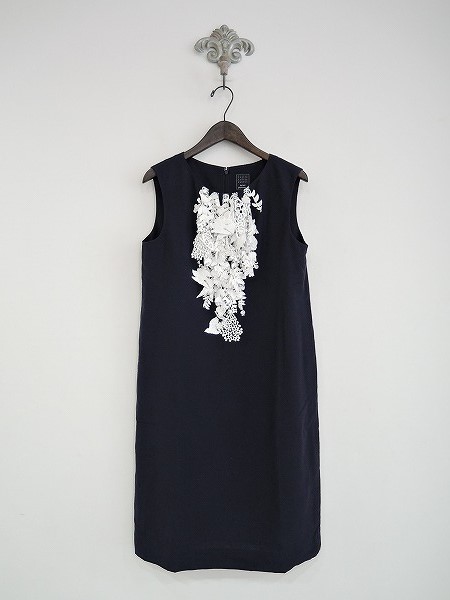 デザイン:2015年春夏コレクション ミナペルホネン 「forest parade」のシルクワンピースです。カラーはネイビーで、節糸&ムラ糸のある薄手素材であしらわれております。フロントにホワイトの刺繍モチーフが施され、バックのフック&ファスナーで着脱でき、裏地付きです。定価72,000円の商品です。 (掲載写真は、実商品のカラーにできるだけ近づけるよう努力はしておりますが、お使いのモニターや画面設定等によっては、色が異なって見える場合もございますので、予めご了承下さい)
