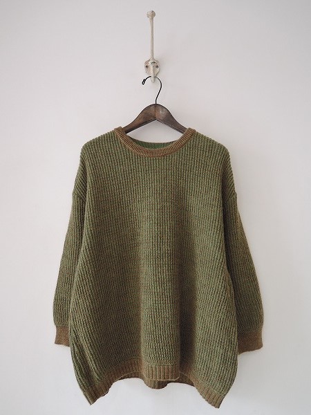 デザイン:mina perhonen 「strudel」のニットプルオーバーです。カラーはグリーン系×ブラウンで、肘部分は、パッチの様な柄であしらわれています。定価20,000円+税の商品です。 (掲載写真は、実商品のカラーにできるだけ近づけるよう努力はしておりますが、お使いのモニターや画面設定等によっては、色が異なって見える場合もございますので、予めご了承下さい)