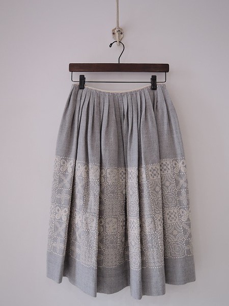 デザイン:mina perhonen 「forest tile」の刺繍スカートです。カラーはミックスグレーベースで、ライトベージュの刺繍が施された微起毛の薄手素材であしらわれております。ウエストにループパイピング&ブランケットステッチ&手折りプリーツが施され、左サイドのフック&ファスナーで着脱でき、裏地付きです。定価60,900円の商品です。 (掲載写真は、実商品のカラーにできるだけ近づけるよう努力はしておりますが、お使いのモニターや画面設定等によっては、色が異なって見える場合もございますので、予めご了承下さい)