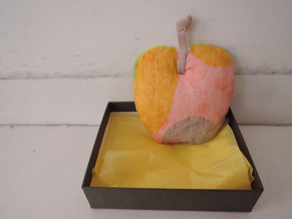 デザイン:mina perhonenのpommeシリーズのリンゴブローチです。カラーはくすんだイエロー・ピンク・グレーの毛羽のある生地で施されたふっくらとしたデザインです。