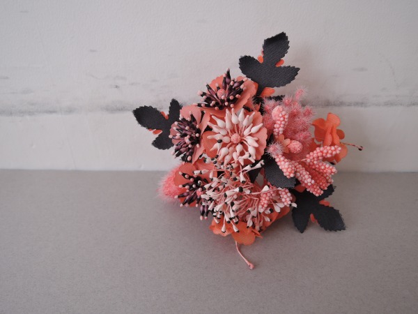 デザイン:mina perhonenのcelebrateシリーズのコサージュです。カラーはオレンジ・パープル・ピンク等の様々なお花であしらわれたデザインです。