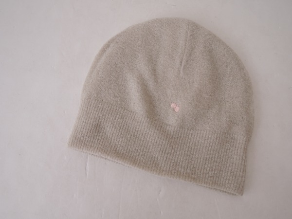 デザイン:mina perhonenのpoemシリーズのニットキャップです。カラーはライトベージュで、薄ピンクで小さな蝶々の刺繍が施されたデザインです。素材はウール48%・アクリル31%・ナイロン21%です。