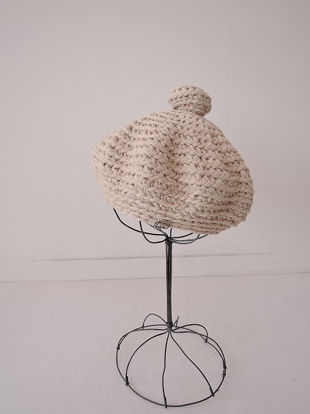 デザイン:mina perhonen×hitomi shinoyamaのニットベレー帽です。カラーはライトベージュのニットで、トップに同素材のポンポンとサイドにラインストーン付きのシルバーのお花モチーフがあしらわれたデザインです。