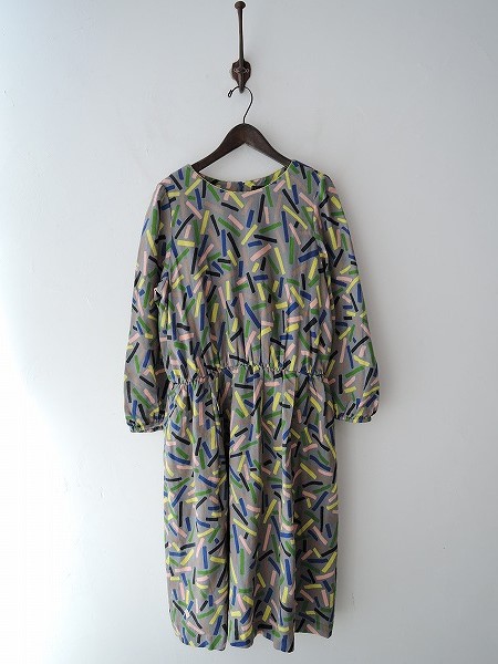 デザイン:mina perhonen 「light stick」のワンピースです。カラーはグレーベースにブルー・イエロー・黄緑・ベージュなどで、薄手素材であしらわれております。バックネックのループボタンで着脱でき、ウエスト&袖口はゴム入りで、裏地付きです。本体価格54,000円のお品です。 (掲載写真は、実商品のカラーにできるだけ近づけるよう努力はしておりますが、お使いのモニターや画面設定等によっては、色が異なって見える場合もございますので、予めご了承下さい)