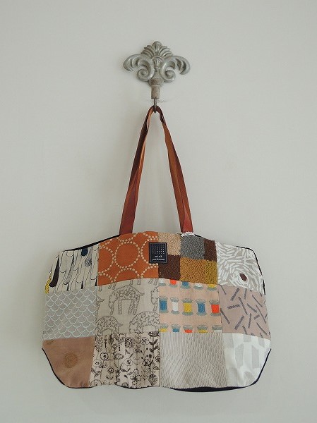 デザイン:mina perhonenのpiece bag ピースバッグです。『tambourine』・『thoroughbred』・『bobbin』等の様々なテキスタイルが使用された贅沢なお品で、持ち手はライトブラウンのレザーです。開口部にはピンクの蝶々刺繍が施されたダークブラウンの被せが付いており、内側にはポケットが2つございます。