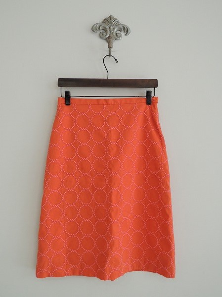 デザイン:mina perhonen 「tambourine」の刺繍入りスカートです。カラーは褪せ感のあるオレンジ×ピンクで、やや薄手のツイル生地に、ドットの膨らんだ刺繍があしらわれております。左のボタン&ジッパー開きで、ポケットはなく、裏地付きです。 (掲載写真は、実商品のカラーにできるだけ近づけるよう努力はしておりますが、お使いのモニターや画面設定等によっては、色が異なって見える場合もございますので、予めご了承下さい)