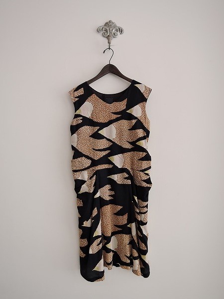 デザイン:mina perhonen 「tour」の総柄ワンピースです。カラーは濃紺ベースにブラウン・ベージュ・マスタード・ピンクの総柄で、薄手素材であしらわれております。両腰に横向きのボックスプリーツが施されたドレープ風のデザインです。プルオーバータイプで、裏地付きです。定価56,700円の商品です。 (掲載写真は、実商品のカラーにできるだけ近づけるよう努力はしておりますが、お使いのモニターや画面設定等によっては、色が異なって見える場合もございますので、予めご了承下さい)