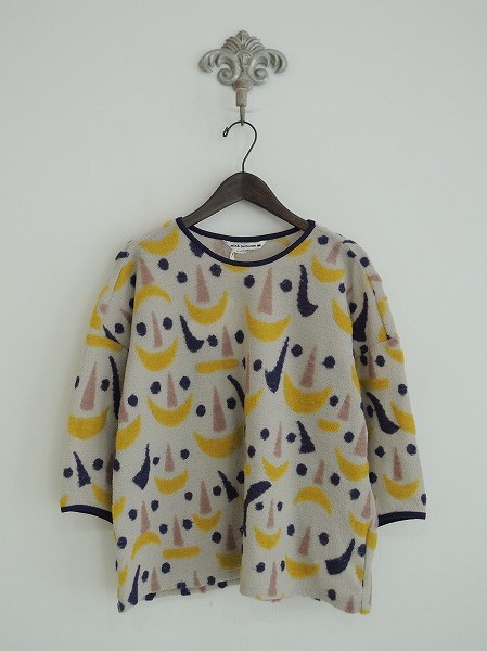 デザイン:mina perhonen「sourire」のニットプルオーバーです。カラーはライトグレー地にマスタード・ネイビー・ブラウンパープルのにっこり顔のモチーフが編み込まれたジャガードテキスタイルです。本体価格18,000円の商品です。 (掲載写真は、実商品のカラーにできるだけ近づけるよう努力はしておりますが、お使いのモニターや画面設定等によっては、色が異なって見える場合もございますので、予めご了承下さい)