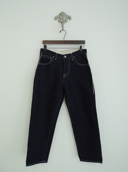 デザイン:mina perhonen 「always」のデニムパンツです。カラーはインディゴネイビーです。5ポケットで、ウエスト周り内側には刺繍入りの別布があしらわれ、フロントボタン&比翼ボタンで着脱できます。本体価格34,000円の商品です。(掲載写真は、実商品のカラーにできるだけ近づけるよう努力はしておりますが、お使いのモニターや画面設定等によっては、色が異なって見える場合もございますので、予めご了承下さい)