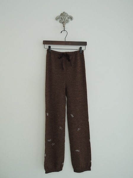 デザイン:mina perhonen「choucho」のニットレギンスです。カラーはブラウンMIXで、ニット地であしらわれております。膝から下に、ライトブルーの蝶が織り込まれており、ウエスト周りにはゴムと腰紐が通され、腰紐はフロントで結べるようになっております。定価11,550円の商品です。(掲載写真は、実商品のカラーにできるだけ近づけるよう努力はしておりますが、お使いのモニターや画面設定等によっては、色が異なって見える場合もございますので、予めご了承下さい)