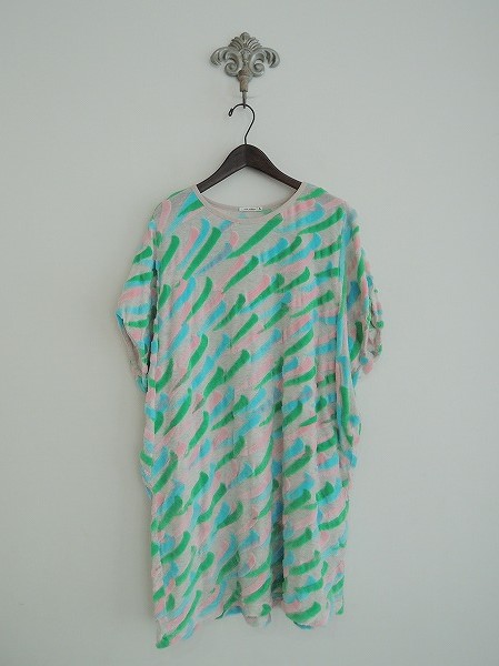 デザイン:mina perhonen「windie」のドルマンワンピースです。カラーはオフホワイト×グリーン×ピンク×ライトブルーで、ジャガード柄が全体にあしらわれております。首周りと袖口周りにはパイピングが施されております。(掲載写真は、実商品のカラーにできるだけ近づけるよう努力はしておりますが、お使いのモニターや画面設定等によっては、色が異なって見える場合もございますので、予めご了承下さい)