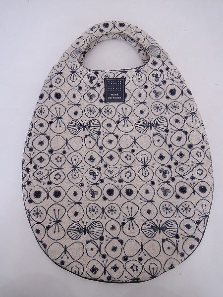 デザイン:mina perhonenのpartyシリーズのエッグバッグです。カラーはベージュ地に紺の刺繍とカットワーク刺繍が一面に施されたデザインで、パイピングは濃紺の合皮です。内側には光沢のある紺の裏地が付いており、素材は表生地が麻100%、刺繍部分が綿100%、裏生地がポリエステル100%です。