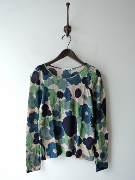 デザイン:mina perhonen 「flower basket」のカットソーです。カラーはグリーン×ベージュ×ピンクベージュ×ネイビーなどで、薄手素材であしらわれております。プルオーバータイプで、肩に細かいギャザーが施されております。(掲載写真は、実商品のカラーにできるだけ近づけるよう努力はしておりますが、お使いのモニターや画面設定等によっては、色が異なって見える場合もございますので、予めご了承下さい)