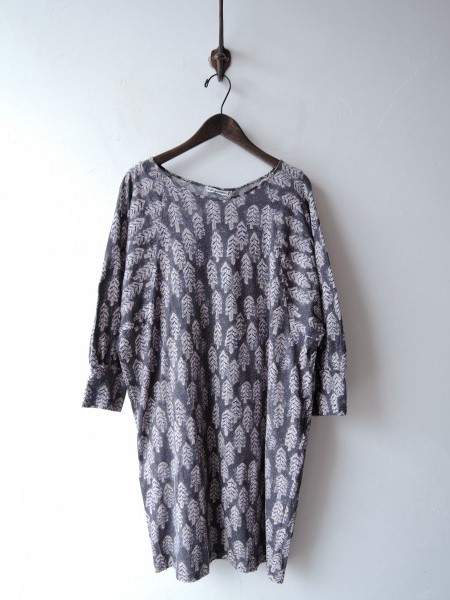 デザイン:mina perhonen 「snow candle」の綿ワンピースです。カラーはグレー×薄いピンク×ネイビーの総柄で、カットソー素材であしらわれております。プルオーバータイプで、ポケット・裏地は付いておりません。定価25,200円です。(掲載写真は、実商品のカラーにできるだけ近づけるよう努力はしておりますが、お使いのモニターや画面設定等によっては、色が異なって見える場合もございますので、予めご了承下さい)