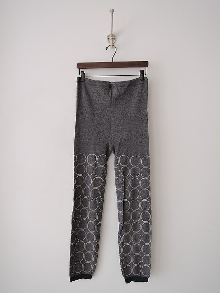 デザイン:mina perhonen「tambourine」のニットレギンスです。カラーはミックスグレーで、ライトグレーベージュのサークル模様が施されたニット素材で、ウエストにゴムが通っています。 (掲載写真は、実商品のカラーにできるだけ近づけるよう努力はしておりますが、お使いのモニターや画面設定等によっては、色が異なって見える場合もございますので、予めご了承下さい)