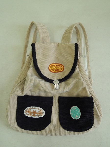 デザイン:mina perhonenのjungle reliefシリーズのリュックサックです。カラーはベージュの凹凸のある生地で、フロント・開口部フラップ部分にはブラックのパイピングと動物の刺繍アップリケがあしらわれたお子様にぴったりのデザインです。素材は綿100%です。