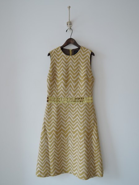 デザイン:mina perhonen 「cascade」のワンピースです。カラーはマスタードイエロー×ライトベージュで、バックジッパーで着脱できます。ウエストまわりはベロア地のリボンがあしらわれております。裏地付きです。(掲載写真は、実商品のカラーにできるだけ近づけるよう努力はしておりますが、お使いのモニターや画面設定等によっては、色が異なって見える場合もございますので、予めご了承下さい)