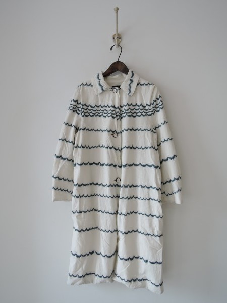 デザイン:mina perhonen「beach」の綿刺繍ロングコートです。カラーはオフホワイトベースで、グリーンの刺繍入りの薄手生地であしらわれております。フロントボタンで着脱でき、両腰にポケット付き、裏地付きです。(掲載写真は、実商品のカラーにできるだけ近づけるよう努力はしておりますが、お使いのモニターや画面設定等によっては、色が異なって見える場合もございますので、予めご了承下さい)