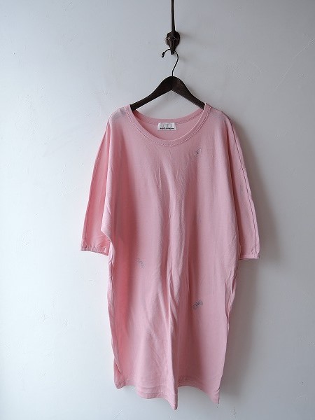 デザイン:mina perhonen「choucho」の刺繍ワンピースです。カラーはピンクで、ダブル仕立てのカットソー地であしらわれております。グレーの蝶の刺繍が施され、袖口にゴムが入っております。 (掲載写真は、実商品のカラーにできるだけ近づけるよう努力はしておりますが、お使いのモニターや画面設定等によっては、色が異なって見える場合もございますので、予めご了承下さい)