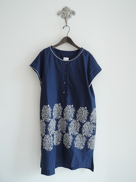 デザイン:ミナペルホネンランドリー 「sometimes lucky」のワンピースです。カラーはネイビーで、フロント4つボタン開閉のプルオーバーでの着脱になります。スカート部分にはオフホワイトの刺繍&カットワーク刺繍があしらわれております。両サイドはスリット入りで、後ろ裾が長くなったデザインであしらわれております。両腰にシームポケット&ウエスト総ゴム入りのアンダースカート付きです。定価は42,000円です。(掲載写真は、実商品のカラーにできるだけ近づけるよう努力はしておりますが、お使いのモニターや画面設定等によっては、色が異なって見える場合もございますので、予めご了承下さい)