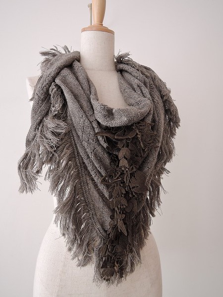 デザイン:mina perhonenのforest paradeシリーズの三角ストールです。カラーはグレーミックスの薄手で透け感がある柄編みデザインで、中央にダークブラウンの繊細な刺繍レースと、縁周りにフリンジがあしらわれています。