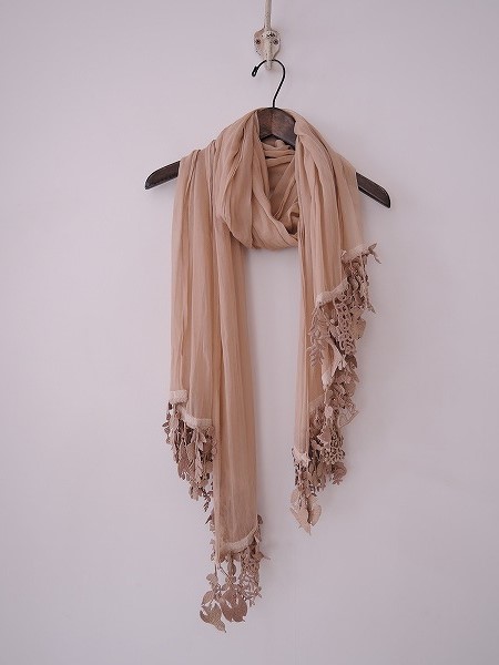 デザイン:mina perhonenのforest paradeシリーズの薄ストールです。カラーはベージュで、両端に小鳥やお花等の繊細な刺繍モチーフがあしらわれた薄手で透けのあるデザインです。