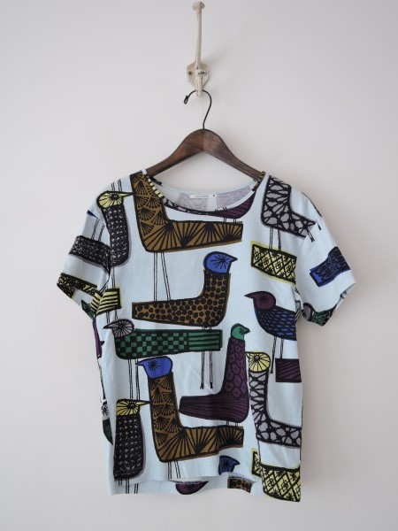 デザイン:mina perhonen 「mingling」の総柄Tシャツです。カラーはライトブルーベースに黒・紫・黄土・黄・青のカラフルなプリントが全面に施されております。 (掲載写真は、実商品のカラーにできるだけ近づけるよう努力はしておりますが、お使いのモニターや画面設定等によっては、色が異なって見える場合もございますので、予めご了承下さい)