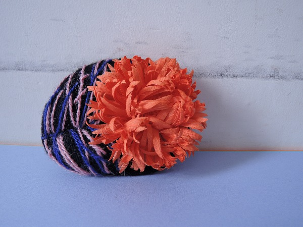 デザイン:mina perhonenのhana no miシリーズのお花コサージュです。カラーはブラック地にピンクとブルーのニット刺繍が施された少し厚みのあるベースにオレンジのお花があしらわれたデザインです。