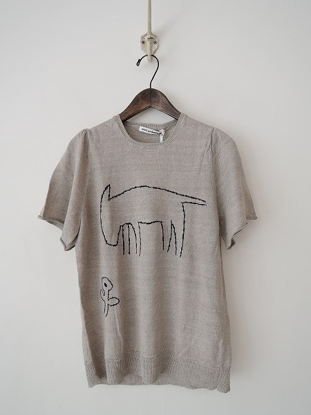 デザイン:2015年SSコレクション mina perhonen「treasure」のリネン半袖ニットです。カラーはナチュラルベージュで、ネイビーの柄が施されています。本体価格32,000円の商品です。(掲載写真は、実商品のカラーにできるだけ近づけるよう努力はしておりますが、お使いのモニターや画面設定等によっては、色が異なって見える場合もございますので、予めご了承下さい)