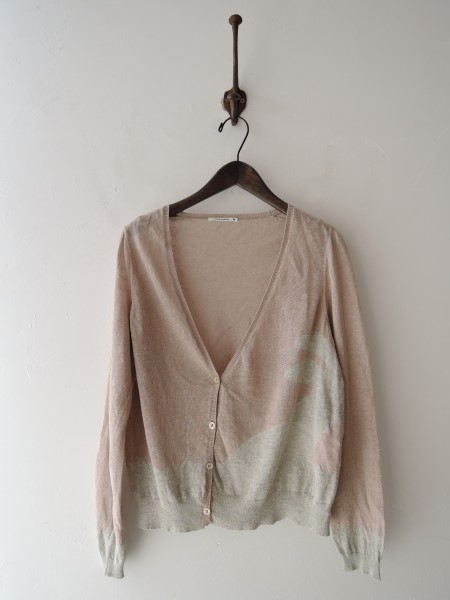 デザイン:mina perhonen「usagi」のニットカーディガンです。カラーはピンクベージュ×ミックスグレーで、薄手ニット素材であしらわれております。フロントボタン開閉で着脱できます。(掲載写真は、実商品のカラーにできるだけ近づけるよう努力はしておりますが、お使いのモニターや画面設定等によっては、色が異なって見える場合もございますので、予めご了承下さい)
