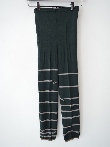 デザイン:mina perhonenのknotシリーズのスパッツです。カラーはダークグリーン×ベージュグレーのリボンボーダー柄編みで、ウエスト部分にはゴム紐が通っています。