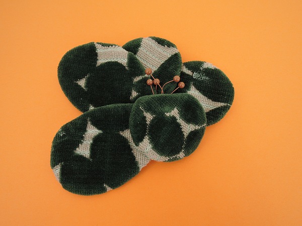 デザイン:mina perhonenのleafシリーズのお花コサージュです。カラーはベージュの柄織りベースにグリーンのパイル刺繍が施されたお花に、赤い花芯があしらわれたデザインです。