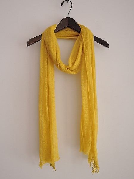 デザイン:mina perhonenの薄手ニットストールです。カラーはマスタードで、透け感のある薄手ニット素材であしらわれております。角には小鳥や木の刺繍モチーフが施されております。