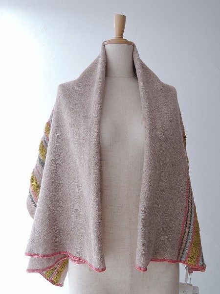 デザイン:mina perhonen 「light mousse」のニットストールです。ベースはグレーベージュのニット素材で、ピンク・宇リーン系・サックス・ライムのマルチボーダー状のニット刺繍が施されております。素材はアルパカ57%、ナイロン20%、ウール18%、アクリル5%で、本体価格は24,000円です。