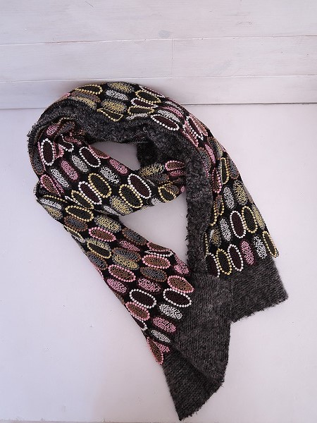 デザイン:mina perhonen 「tarte」の刺繍×ボアマフラーです。ベースはダークグレーミックスのニットボア素材で、表面はブラックのメッシュ生地ベースにピンク・ボルドー・グレー・イエローダークグリーン・ライトブラウンのカラフルな刺繍が全面に施されております。