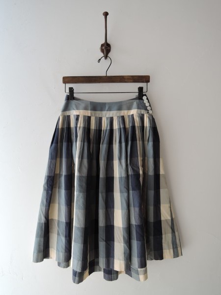 デザイン:mina 「garasu」のチェック柄フレアスカートです。カラーはブルーグレー×ネイビー×クリームで、チェック織地であしらわれております。切替下はピンタック入りでフレアなシルエットになっており、左腰のボタン&ジッパーで着脱できます。(掲載写真は、実商品のカラーにできるだけ近づけるよう努力はしておりますが、お使いのモニターや画面設定等によっては、色が異なって見える場合もございますので、予めご了承下さい)