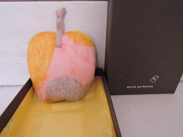 デザイン:mina perhonenのpommeシリーズのりんごブローチです。カラーはピンク・グレー・山吹色・イエローで、中綿色のふっくらとしたお品です。