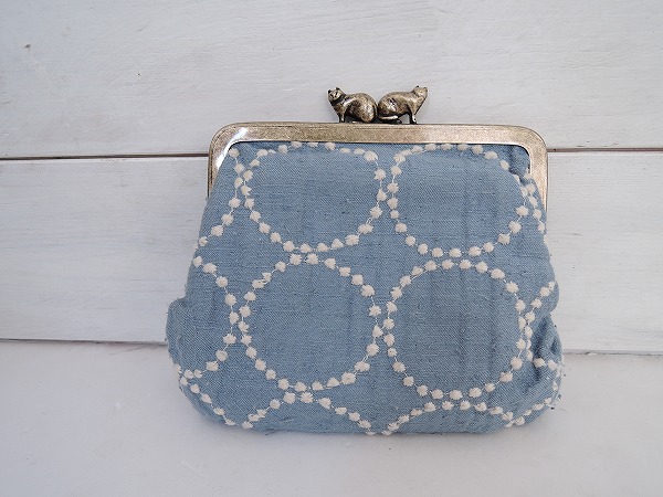 デザイン:mina perhonenのtambourineシリーズのカドルパースです。カラーは少しくすんだ水色地にオフホワイトで刺繍が施されたデザインで、開口部は猫のモチーフがあしらわれたがま口仕様です。内側はライトベージュのレザーであしらわれており、グリーン掛かったグレーのがま口ポケットが1つと、カード収納ポケットが1つ付いています。