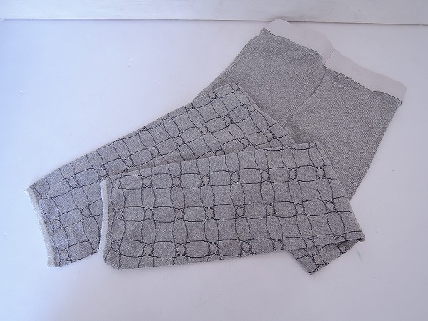 デザイン:mina perhonenのcantuccioシリーズのスパッツです。カラーはライトグレーミックス地にダークグレー・ライトベージュの柄織りデザインで、裾周りはシルバーのラメ糸が使用されたリブ編みです。