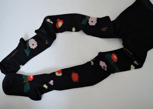 デザイン:mina perhonenのflower basketシリーズのタイツです。カラーは濃紺地にレッド・イエロー・グリーン等のハートやお花等の柄織りが施されたデザインです。