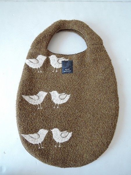 デザイン:mina perhonenのtori to hanaシリーズのエッグバッグです。カラーはミックスブラウンの毛羽のある素材で、フロントにライトベージュで小鳥の刺繍と、裏側にお花の刺繍が施されたデザインです。パイピング部分はダークブラウンの合皮で、内側には光沢のあるダークブラウンの裏地が付いており、素材は表地が毛100%、刺繍部分がレーヨン100%、裏地がポリエステル100%です。