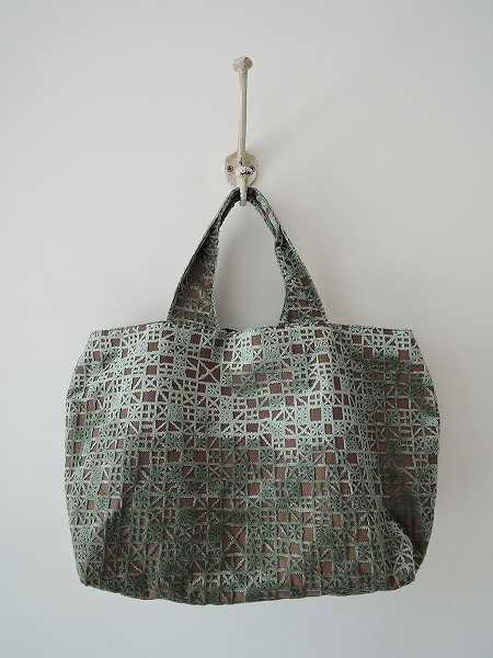 デザイン:mina perhonenのmeriシリーズのパニーニバッグ大です。カラーはカーキブラウン地にグリーン掛かったグレーのパイル刺繍が全面に施されたデザインです。内側はカーキブラウンの別布であしらわれており、オフホワイトの蝶の刺繍の被せとポケットが2つ付いています。素材は表地が綿50%、麻50%、パイルがアクリル100%です。