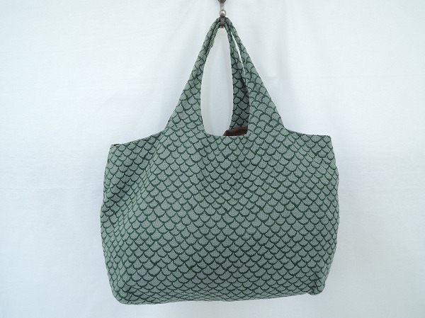 デザイン:mina perhonenのmermaidシリーズのパニーニバッグです。カラーはグレー地にグリーンの刺繍が一面に施されたデザインで、開口部にはベージュの蝶々刺繍が施されたカーキブラウンの被せが付いています。内側にはポケットが2つあり、素材は表生地が麻100%、刺繍部分が綿100%、裏生地が麻100%です。