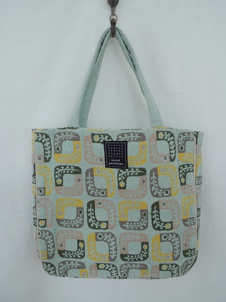 デザイン:mina perhonenのloloシリーズのトートバッグです。カラーはライトグレー地にグリーン・ピンク・イエロー等の刺繍が施されたデザインで、パイピングはベージュの合皮です。内側には淡いミントグリーンの裏地とポケットが1つ付いており、素材は表生地が綿57%絹43%、刺繍部分が綿100%、裏生地が綿100%です。