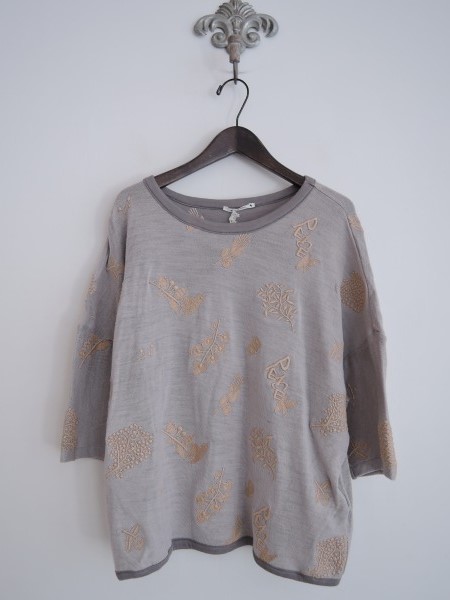 デザイン:mina perhonen 「forest parade」のプルオーバーです。カラーはライトグレーベースにベージュの刺繍で、裏面カットソーの柔らかなニット素材であしらわれております。定価31,500円の商品です。 (掲載写真は、実商品のカラーにできるだけ近づけるよう努力はしておりますが、お使いのモニターや画面設定等によっては、色が異なって見える場合もございますので、予めご了承下さい)